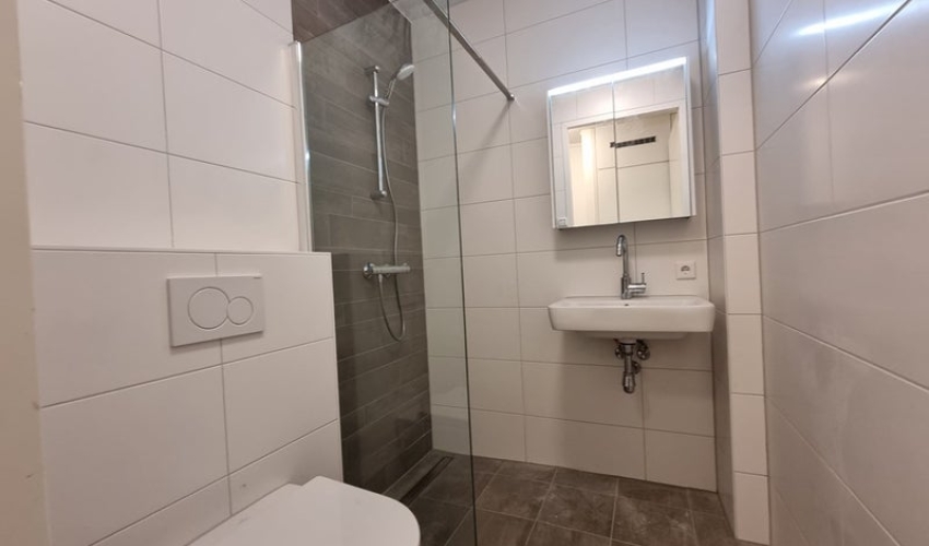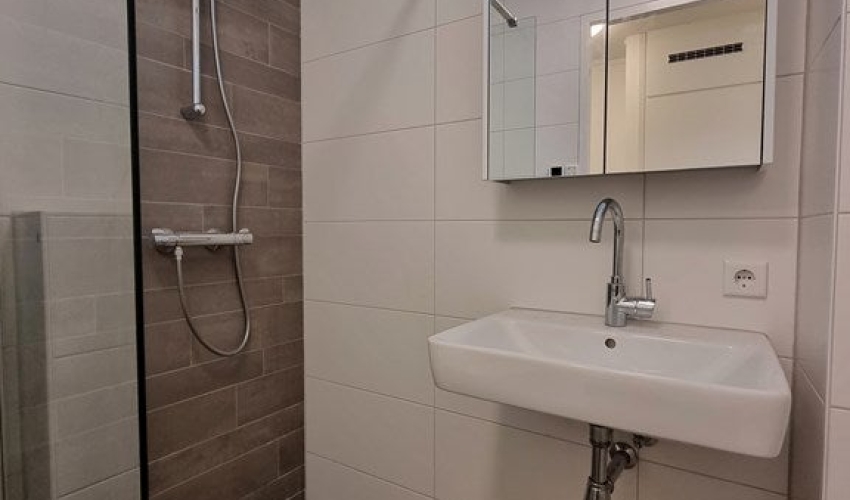 Entree in de gang, links is de CV-ketel ruimte met wasmachine aansluiting, aansluitend de badkamer met inloopdouche, wastafel met meubel met spie...... Als je verder klikt kom je bij een nieuwe pagina met uitgebreide informatie over de huurwoning en met de directe contactgegevens van de beheerder