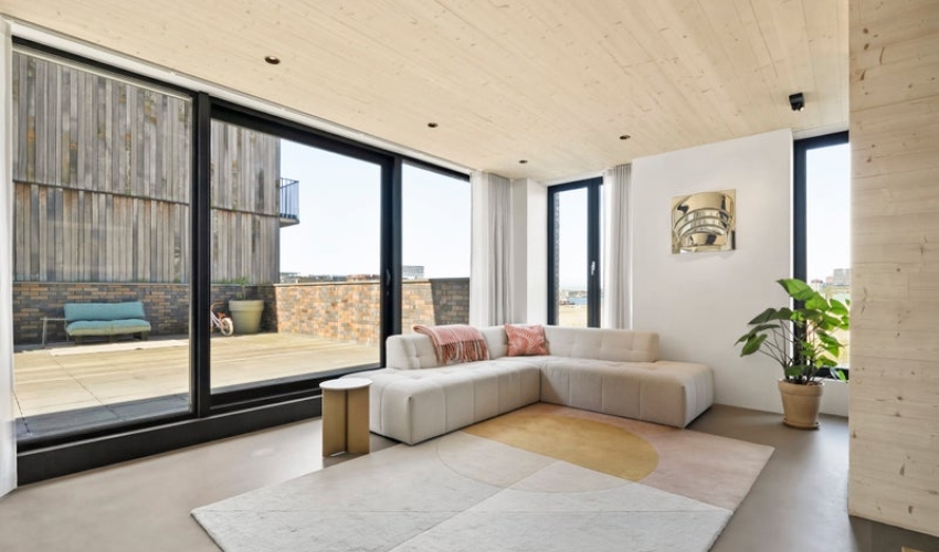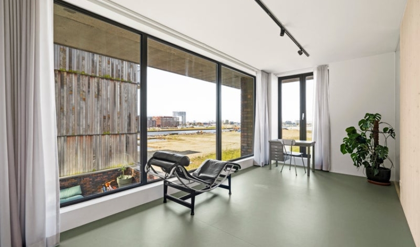 Unieke, zeer duurzame en lichte hoekwoning (150 m²) met loft-achtig karakter, hoge plafonds (5,3m²), privé parkeerplaats en een spectaculair dakterras (ca. 96 m²) op het zuiden met uitzicht over het IJ! Deze woning is te koop aangeboden door 020-Makelaars, een MVA Gecertificeerde Expat Makelaar. LOCATIE