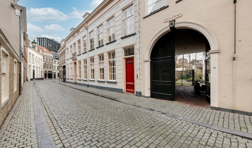 In een monumentaal pand in het hartje van Breda gelegen 2-kamer appartement met lift, Frans balkon, schitterende gezamenlijke tuin (zgn. Merkxtuin) en gezamenlijke fietsenberging. Het appartement is bijzonder karakteristiek en gelegen op de eerste verdieping. Entree met vloerbedekking, van hieruit zijn alle vertrekken bereikbaar. In de entree bevindt zich de meterkast. Woonkamer: