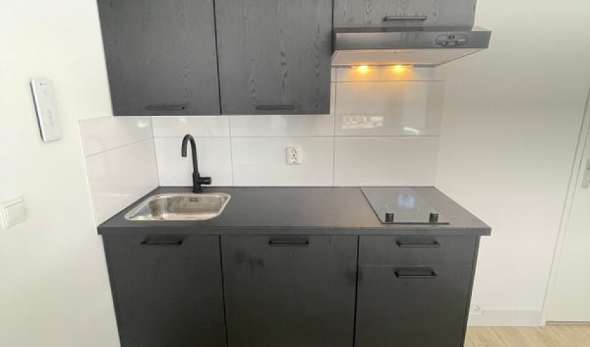 Entree, hal, badkamer met douche, toilet, wastafel en wasmachine opstelling. Woonkamer met bergkast, keukenblok met koelkast, afzuikap en electrisch koken, slaapkamer met toegang tot balkon. Op de begane grond bevindt zich de berging. Privé parkeerplaats € 60,50 per maand, zit bij de huurprijs in.