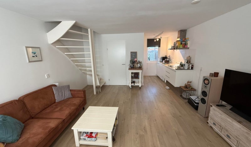 Entree vanuit voortuin naar hal, alwaar meterkast zich bevindt en toegang tot de woonkamer/keuken. Z-vormige woonkamer met half open keuken is voorzien van een laminaat vloer.