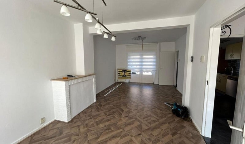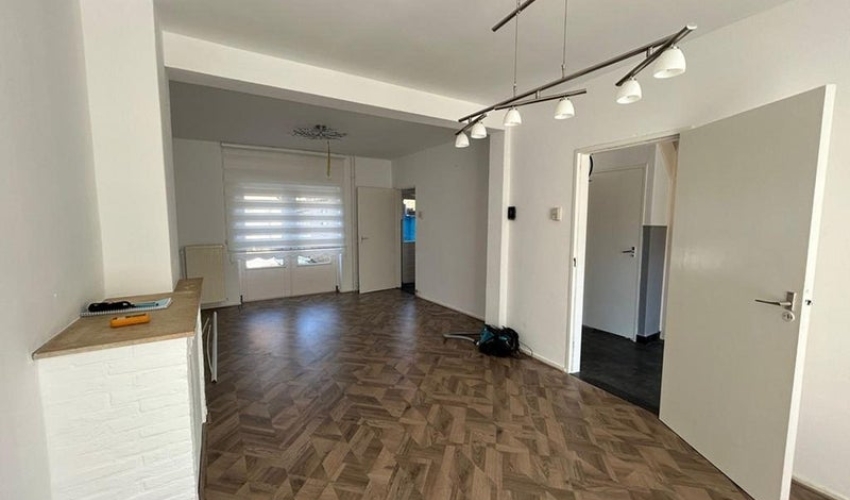 Doorzon woonkamer van +/- 28m2 met openslaande deuren naar de ruime tuin welke voorzien is van een berging.
