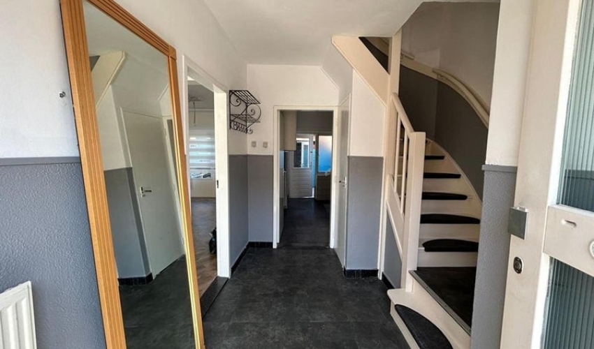 Ruime entree met toegang tot de woonkamer, gesloten keuken, toilet en trap naar de eerste verdieping.
